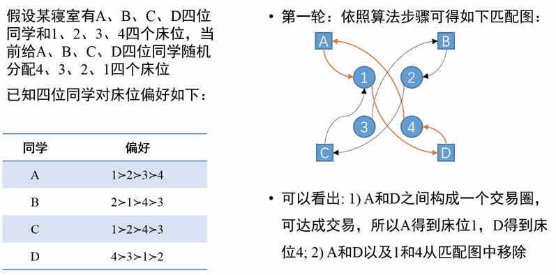 - 此时形成一张有向图,且比存在交易圈,对于交易圈中的交易者,将每人指向节点所代表的标的物赋予其,同时交易者放弃原先占有的标的物,占有者和匹配成功的标的物离开匹配市场