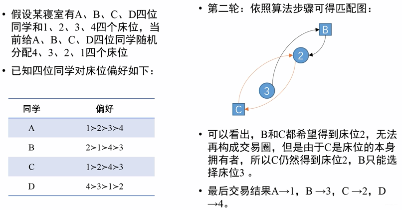 - 匹配问题中,还有一类交换不可分的的标的物的匹配问题,被称为单边匹配问题,如远古时期以物易物、或者宿舍的床位分配。