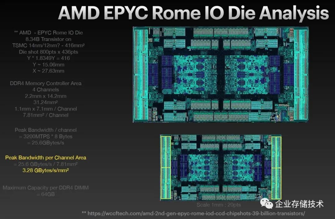 上图是AMD EPYC Roma的IO Die分析,重点指出每个内存通道控制器的最大带宽/所占芯片面积是25.6GB/s / 7.9mm,平均带宽密度3.28GB/s/mm2。