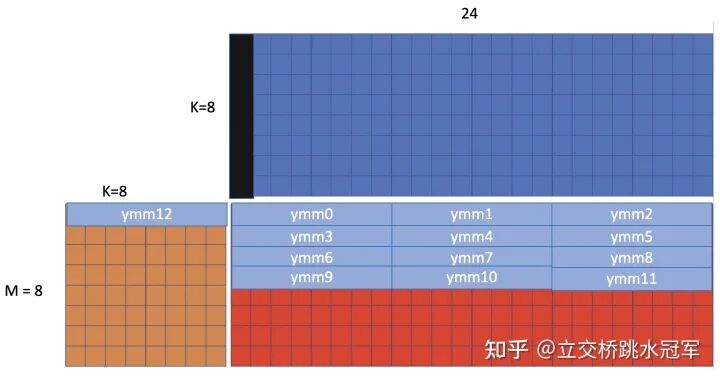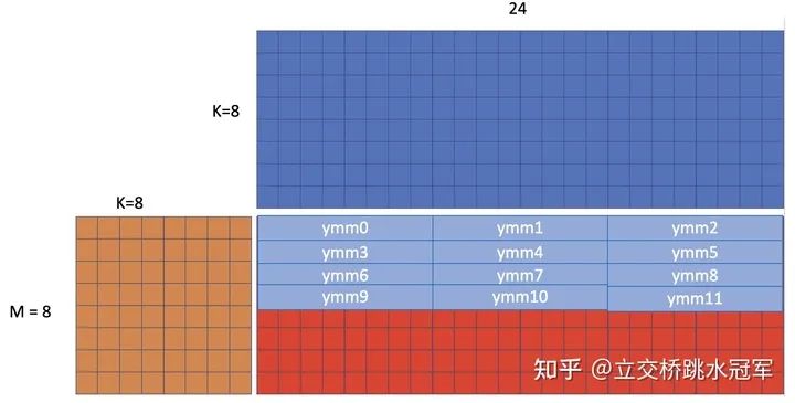 现在可以隐约看出来为什么大佬要固定24这个数字了:因为ymm寄存器只有16个,我们又希望行数可以比较整,那么我们每次处理4行比较合适,处理4行的话,每行可以有16/4=4个寄存器。但是我们要做向量运算的话,那我们一定又要有向量寄存器当作运算符,所以我们不能把这16个寄存器都用来存output。所以权衡一下,那我们每行用3个寄存器好了,这样总共12个寄存器存结果,剩下4个用来搞搞计算。因为ymm是256bit的,可以存8个float类型,所以我们每列就应该是24