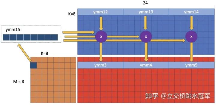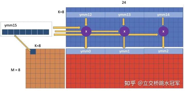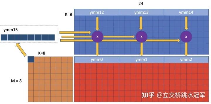 用排除法,我们别无选择,只能把ymm用到B上面。B也是24列,我们用3个ymm就存下了。还剩一个,我们先把A的第一行第一列的数字读出来,把它复制8份拓展成一个ymm,然后和这三个B的ymm作element-wise的乘法,把结果累加到ymm0~ymm2里。