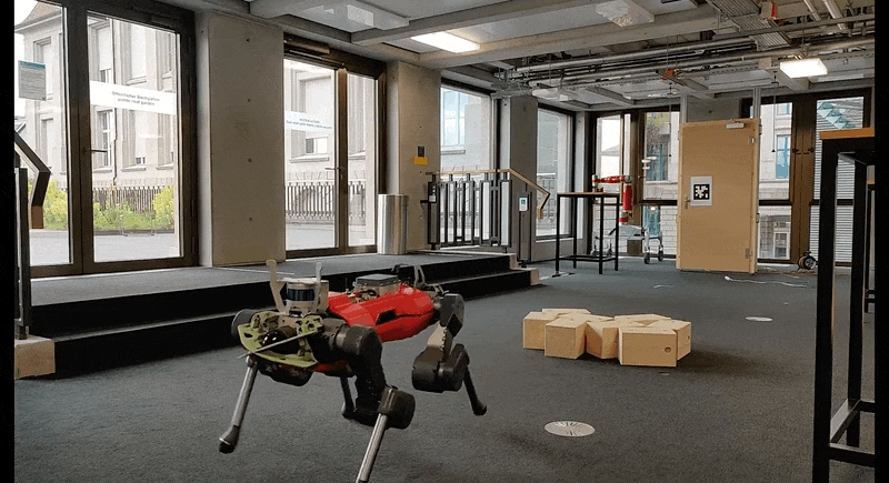 研究者还为 ANYmal 开发了一个粗糙地面的运动任务,并通过将训练好的策略转移到实体机器人上来验证了该方法的有效性。机器人学习在不平坦的地面、斜坡、楼梯和障碍物上行走,除了对平坦地形环境的观察外,它还需要接收机器人周围地形高度的测量数据。