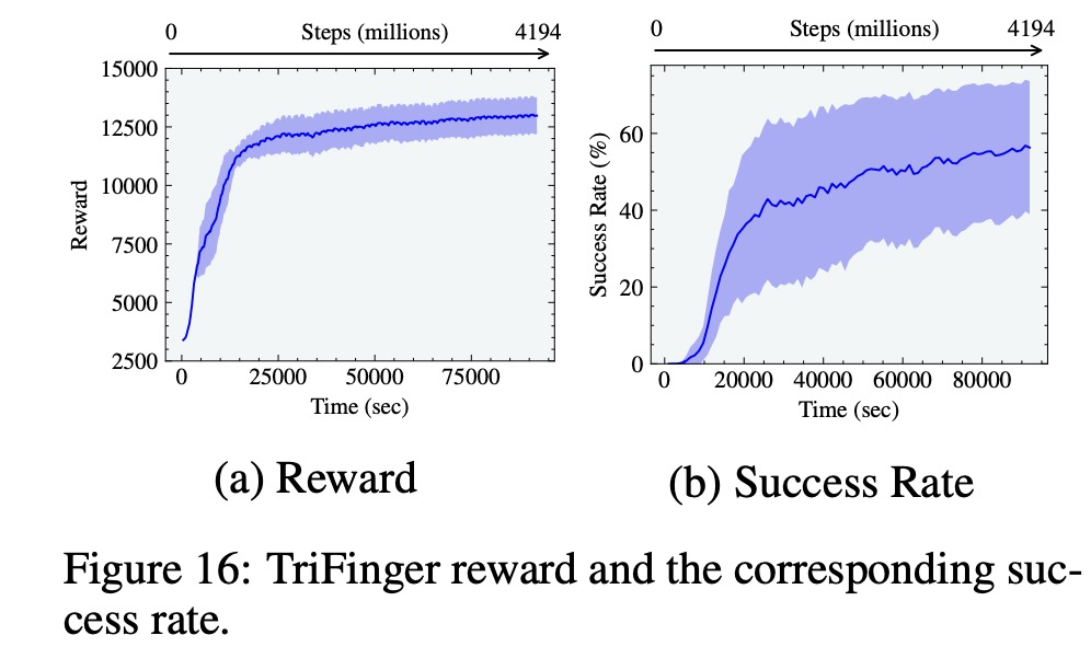 该研究使用不对称的 actor-critic 和域随机化重现 OpenAI Shadow Hand 立方体的训练设置。实验结果表明,该研究在 A100 上,前馈连续 20 次成功和 LSTM 网络连续 37 次成功,平均分别在大约 1 小时和 6 小时内获得与当时 OpenAI 实验结果相似的性能,成功容差为 0.4 rad。相比之下,使用传统 RL 训练设置,在 CPU 集群(384 个 CPU,每个 CPU 具有 16 个内核)和 8 个 NVIDIA V100 GPU、MuJoCo 的组合上,OpenAI 的工作分别需要 30 小时和 17 小时。