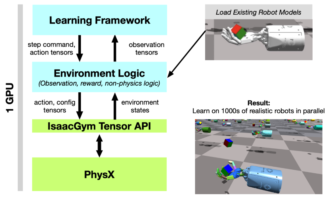 图 2:系统概述。Tensor API 提供了一个 Python 代码接口,可以直接在 GPU 上实现 PhysX 后端以及 get 和 set 模拟器状态,在整个 RL 训练 pipeline 中能实现 100 倍到 1000 倍的速度提升,同时提供高保真度的仿真,并且能够与现有机器人模型连接。