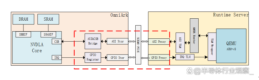 在设计移植到OmniArk芯神鼎硬件仿真系统后,Runtime Server端采用QEMU模拟运行ARMv8,并通过TLM Wrapper将其挂载到AMBA总线上。OmniArk芯神鼎硬件仿真系统仿真运行NVDLA,通过AXI Transactor(简称Xtor)、GPIO Transactor挂载到AMBA总线上。Runtime Server和OmniArk芯神鼎硬件仿真系统之间通过SCE-MI协议进行软硬件协同仿真。
