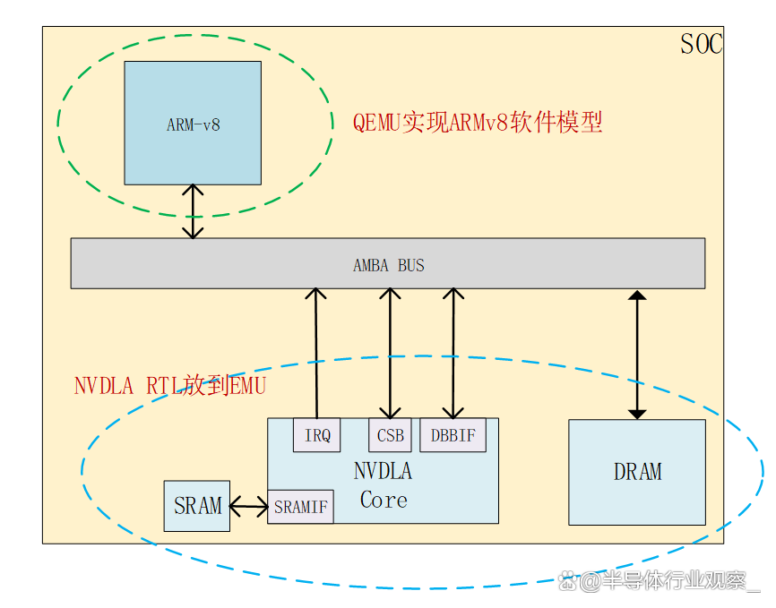 以混合仿真一个SoC芯片设计为例。SoC整体系统架构如下图所示,主要由ARMv8 CPU、AMBA BUS、NVDLA和DRAM等模块组成。为了实现QEMU虚拟平台与OmniArk芯神鼎硬件仿真系统的混合仿真,我们将NVDLA和DRAM移植到OmniArk芯神鼎硬件仿真系统中进行仿真,同时使用QEMU实现ARMv8的软件模型。