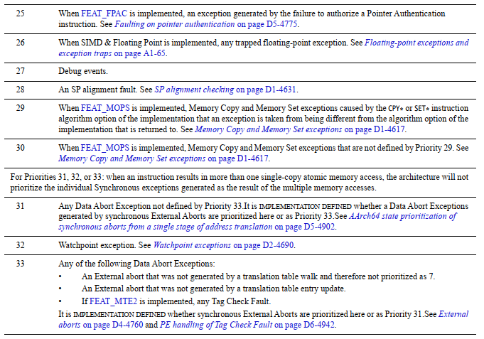 (2) irq和fiq属于异步异常,具有同样的优先级。而同步异常的优先级又高于异步异常的优先级,同意异常的优先级如下所示(也就意味着以下同步异常都可以打断正在执行的irq/fiq):