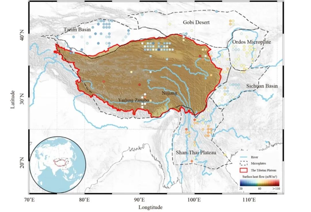由于青藏高原的实测数据集较少,现有观测主要集中于高原边缘,内部区域了解有限。因此研究人员将周边板块的地表热流测量数据纳入其中来扩充数据集。