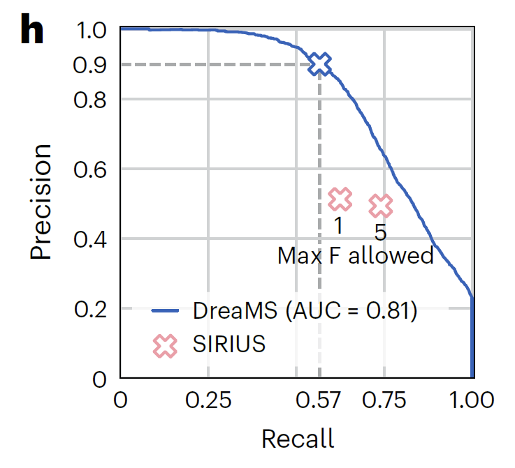 在最具挑战性的含氟分子检测任务中,如下图所示,DreaMS 通过概率预测模型实现 0.91 的精确度与 0.57 的召回率,远超依赖碎裂规则组合搜索、精确度仅 0.51 的 SIRIUS 算法,尤其在结构新颖的分子检测中展现出强泛化能力,为氟化物相关药物研发与环境监测提供了关键工具。