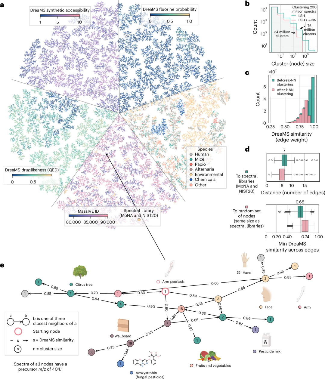 基于高效的计算效率(100 万光谱嵌入计算在 NVIDIA A100 GPU 上仅需 1 小时),如下图 a-d 所示,研究团队构建了包含 2.01 亿条质谱图的 DreaMS 图谱,通过局部敏感哈希聚类生成 3,400 万节点的三近邻(3-NN)图,67% 的边相似性高于 0.8,99.7% 节点形成单一连通分量,最短路径分析显示其能通过 6 步内连接任意光谱与已知库条目。