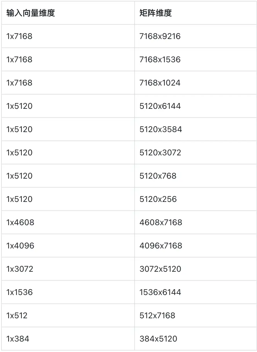 编写可以对矩阵向量乘法进行计算的核函数,输入向量为fp16格式,矩阵参数采用w4a16量化形式,选手可在参数加载过程中对参数在显存中的排布方式进行调整。输出结果精度要求atol和rtol均满足1e-2。计算核函数需要支持以下尺寸的GEMV运算,可以针对不同的计算尺寸设计不同的计算核函数,也可以实现一个统一的计算核函数。